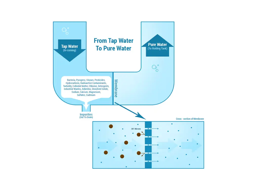 A Reverse Osmosis water purifier filters impurities through a semi-permeable membrane. Under pressure, water passes through the RO membrane, allowing only water molecules and very small molecules to pass, thereby removing most contaminants such as minerals, salts, metals, bacteria, and viruses.