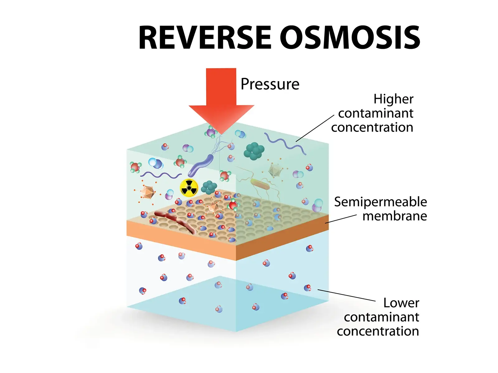 Reverse Osmosis (RO) is a water treatment process that removes contaminants from water by using pressure to force water molecules through a semipermeable membrane. During this process, the contaminants are filtered out and flushed away, leaving clean, delicious drinking water. Reverse osmosis is capable of removing up to 99 percent of 65 different contaminants, including lead, fluoride, PFOS, pesticides, chlorine, dissolved salts, and more.