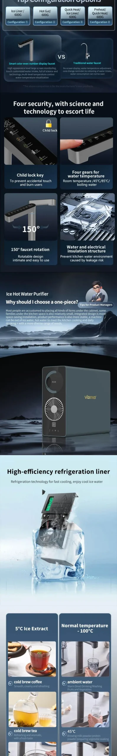 7. Cold and hot water diversion, instant state switching. Multiple water temperature options are available, including room temperature water, cold water, boiling water, etc. It can be used to make milk, tea or for direct drinking.