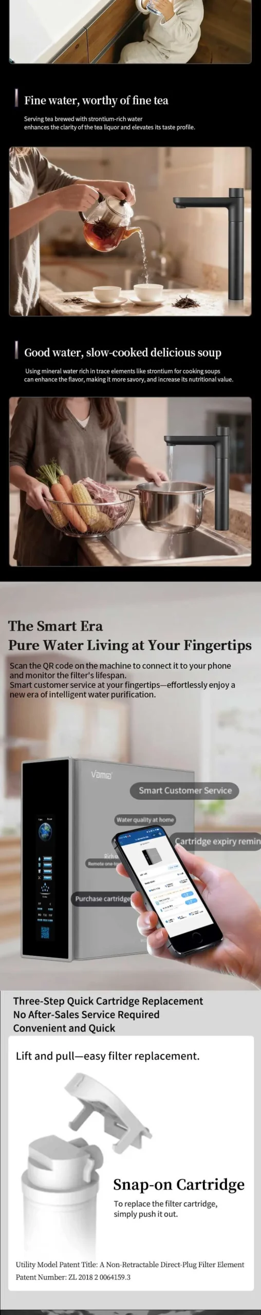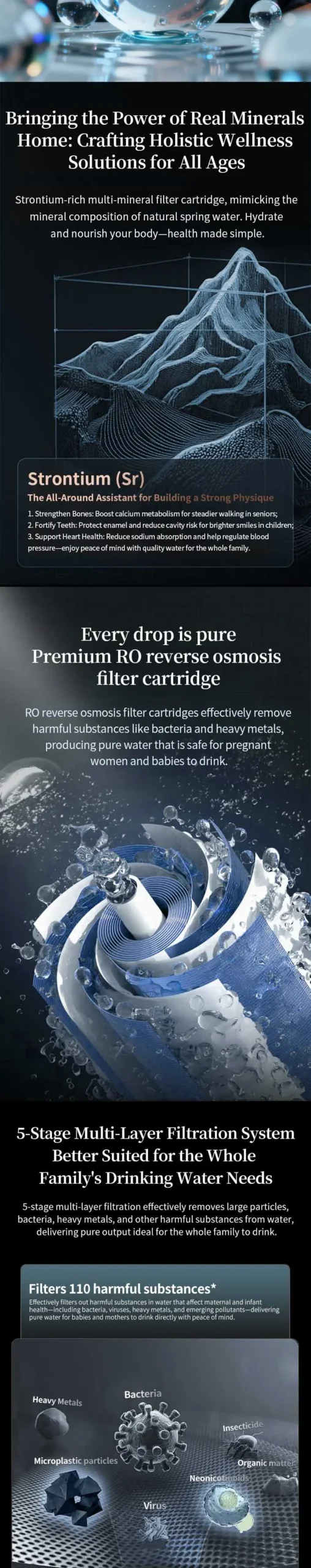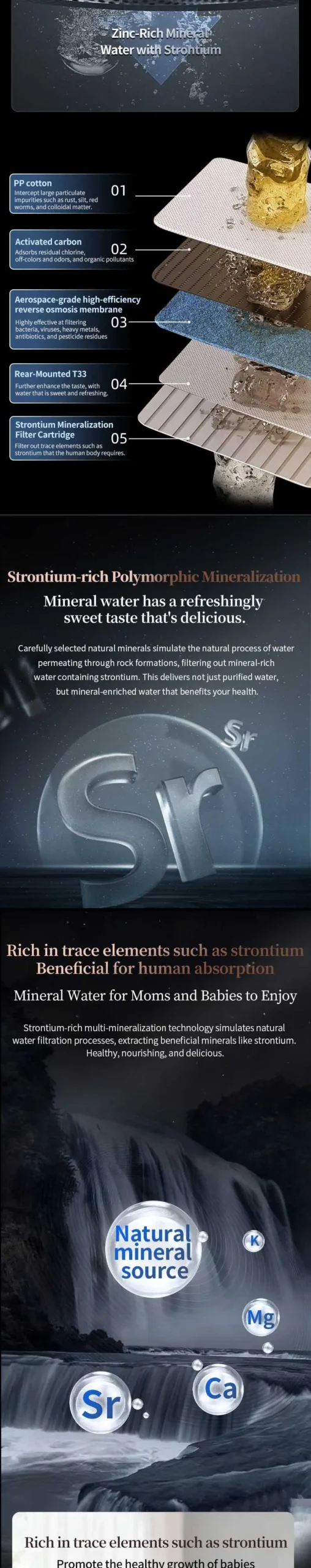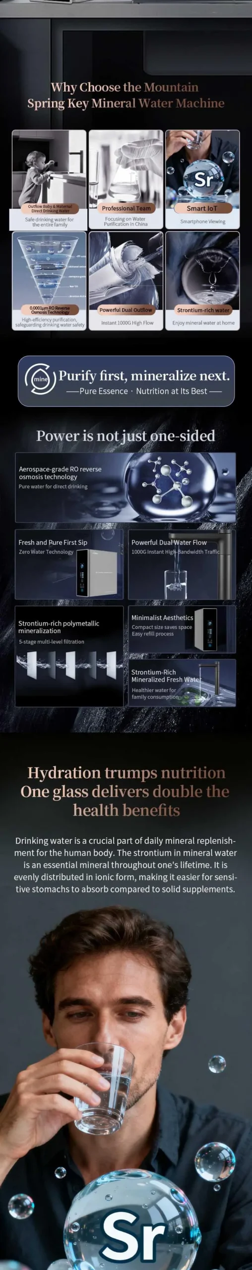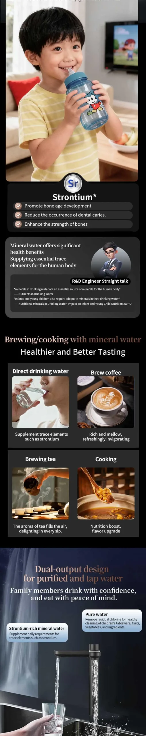 👉: Purification + Mineralization, dual water output design, adopts rich strontium multi-mineralization system