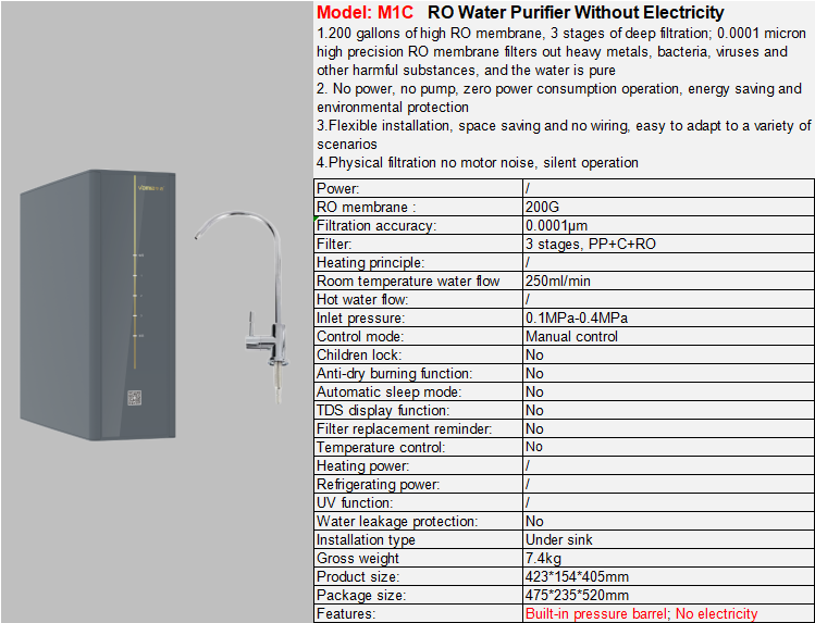 M1C no power no pump reverse osmosis drinking home use physical filtration 200 gallons water purifier