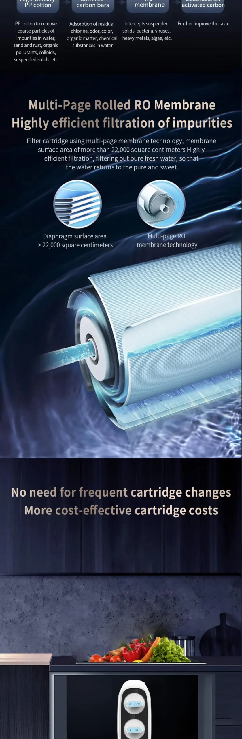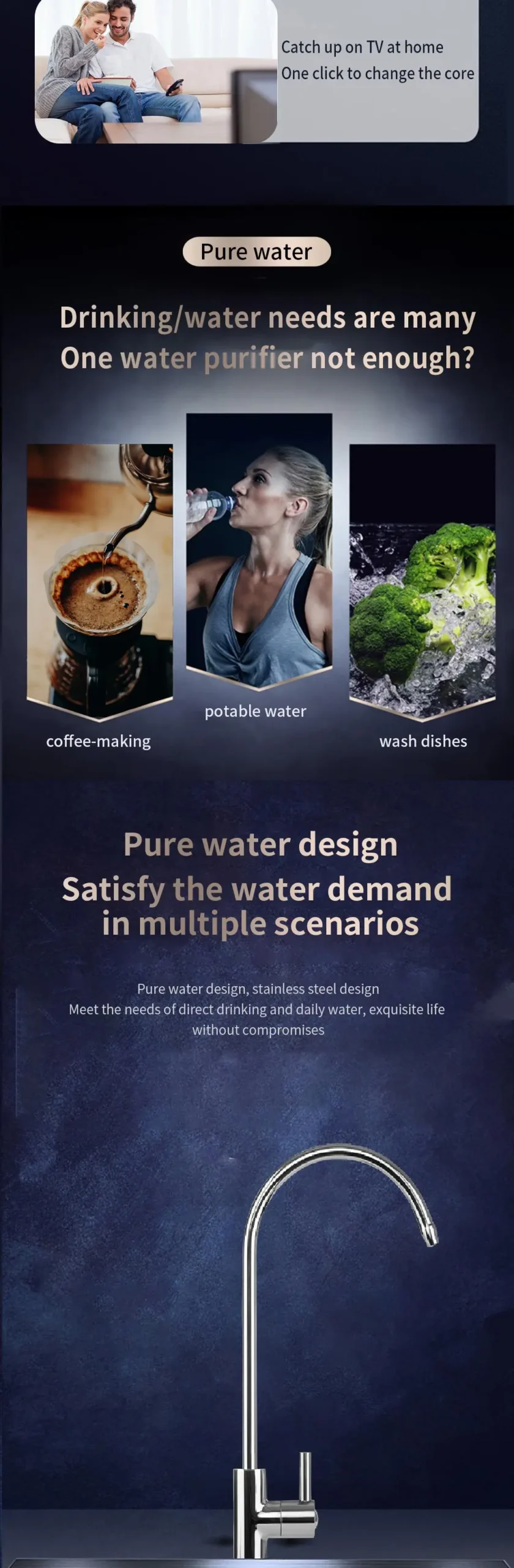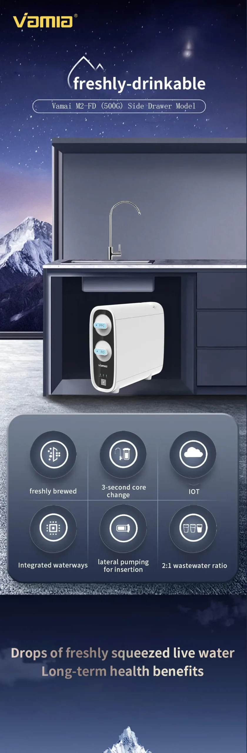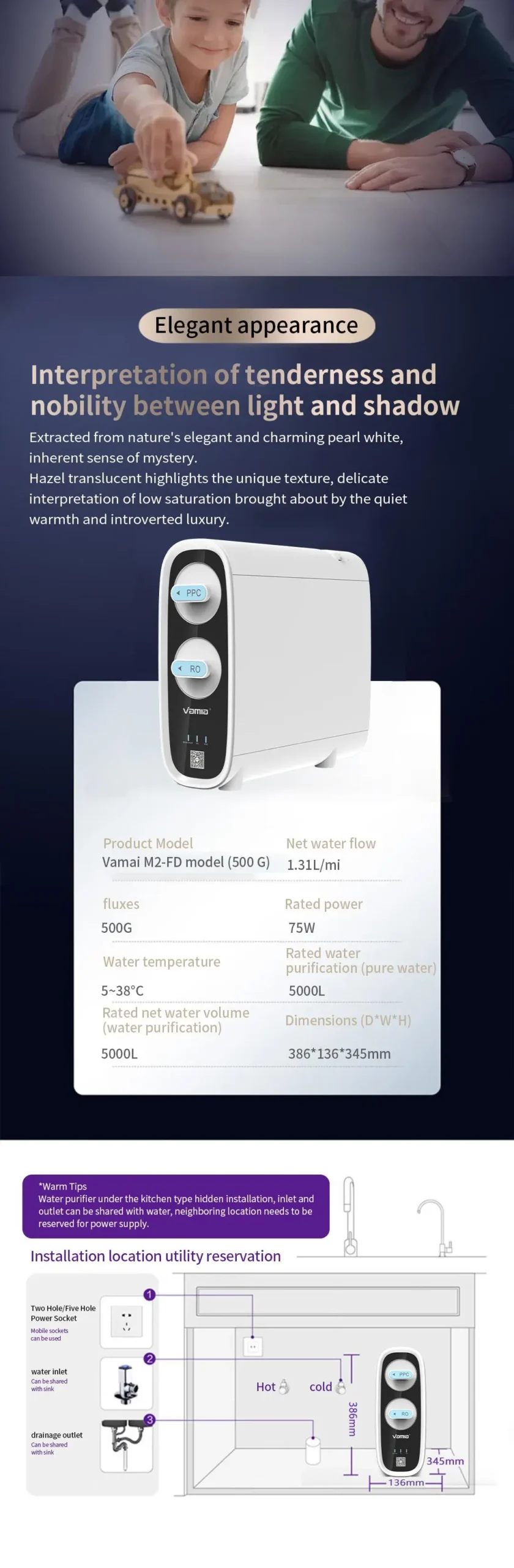 M2FD model is integrated waterway design, water and electricity separation, safe and efficient water purifier. Using the United States GE diaphragm, aerospace grade RO reverse osmosis technology, water can be drunk. Advanced configuration brings better experience, original and leading technology, so that the product durability, stability is stronger, achieve lower core replacement costs. High quality activated carbon Apex linguae can enjoy the sweetness. Fresh water technology, fresh and sweet, not overnight water, effectively solve the problem of high TDS value of the first glass of water