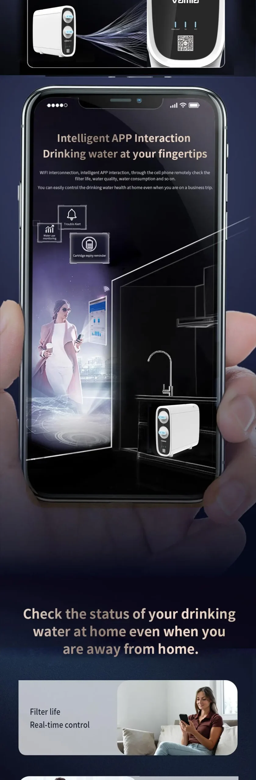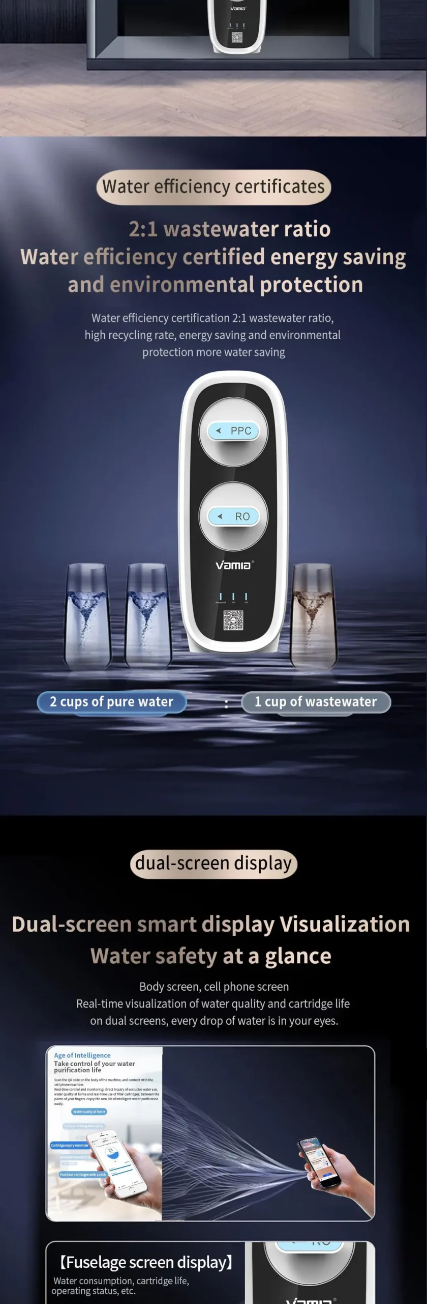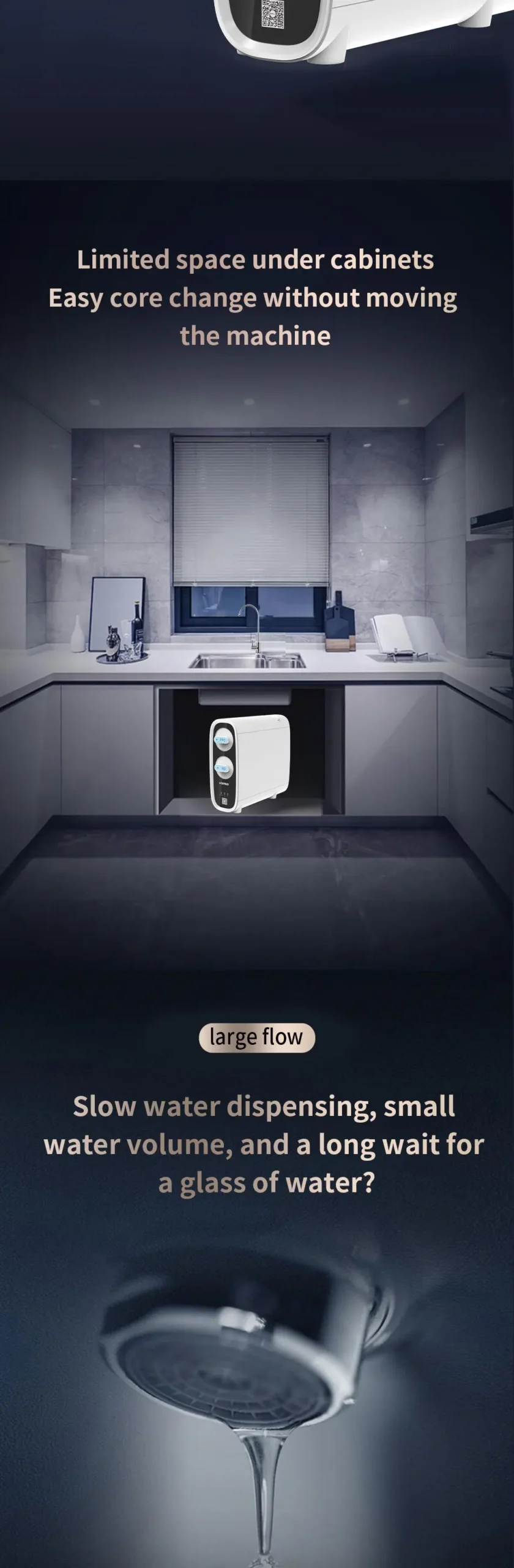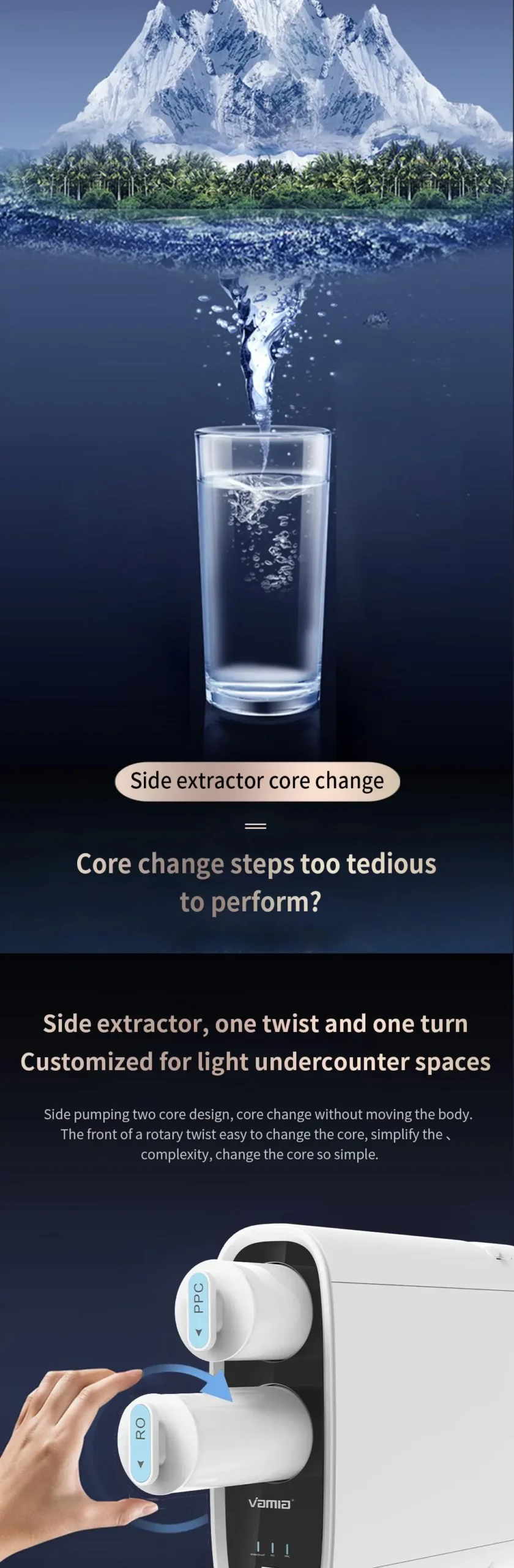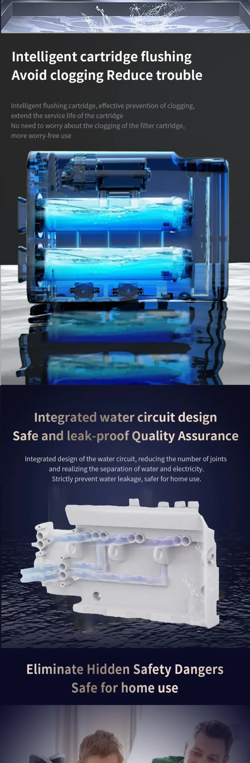 M2FD model is integrated waterway design, water and electricity separation, safe and efficient water purifier. Using the United States GE diaphragm, aerospace grade RO reverse osmosis technology, water can be drunk. Advanced configuration brings better experience, original and leading technology, so that the product durability, stability is stronger, achieve lower core replacement costs. High quality activated carbon Apex linguae can enjoy the sweetness. Fresh water technology, fresh and sweet, not overnight water, effectively solve the problem of high TDS value of the first glass of water