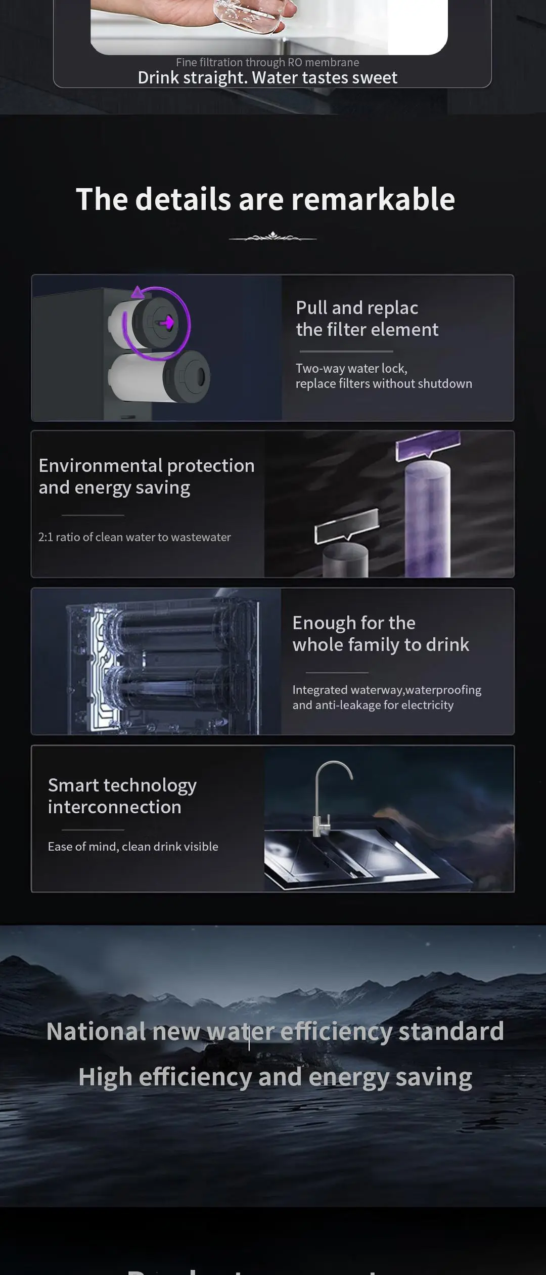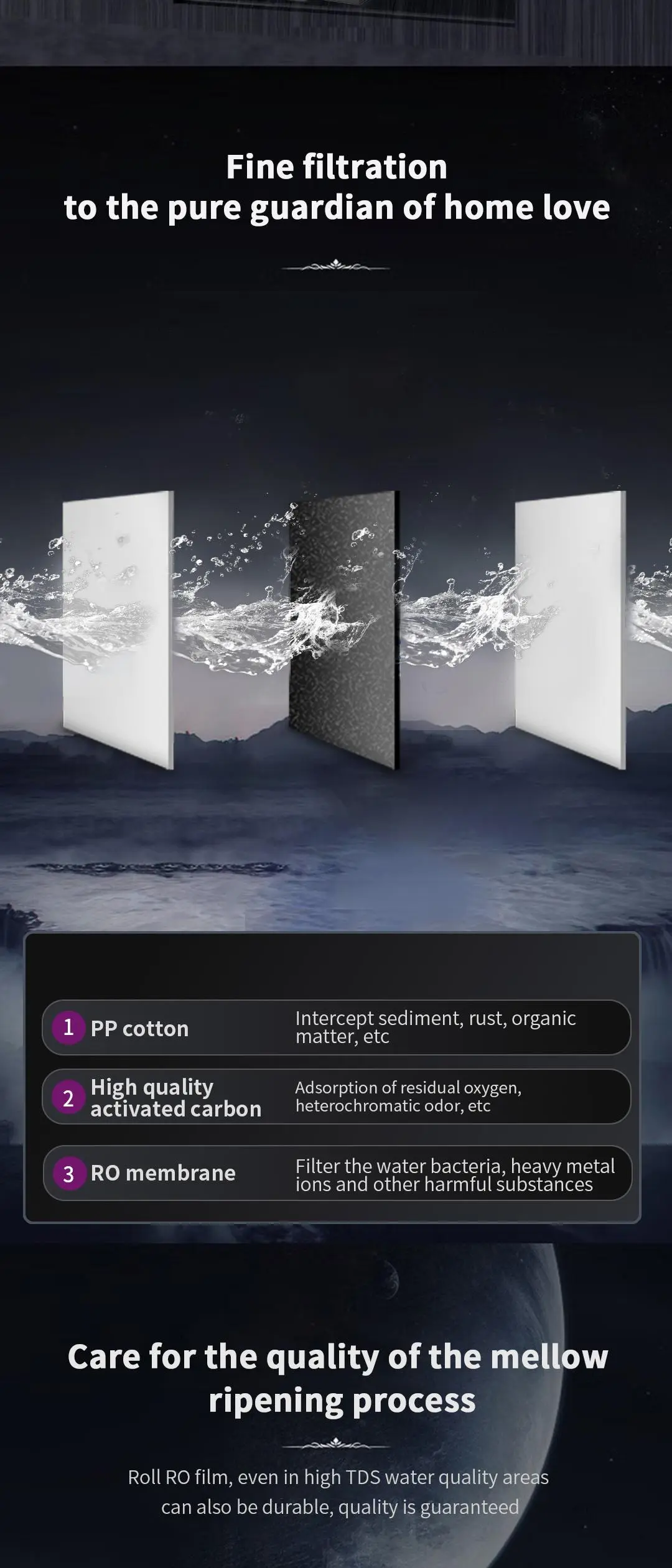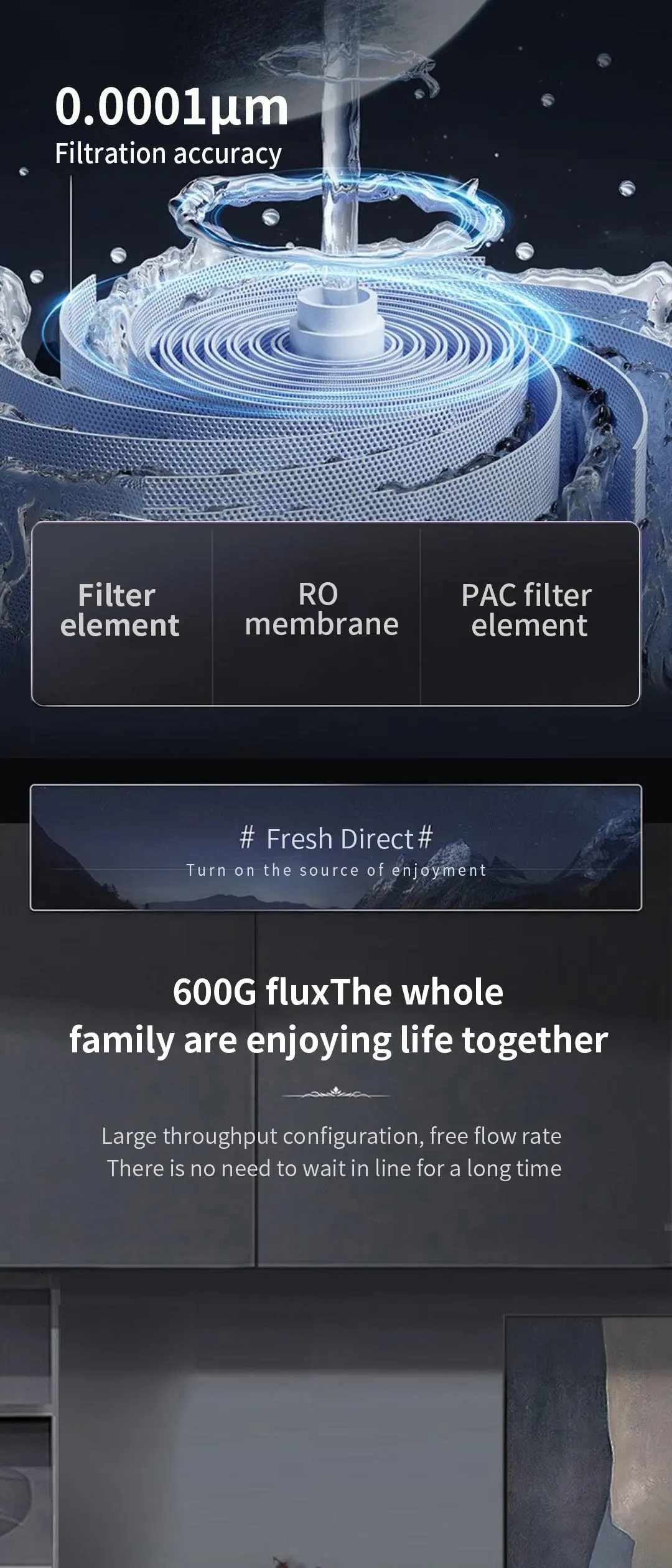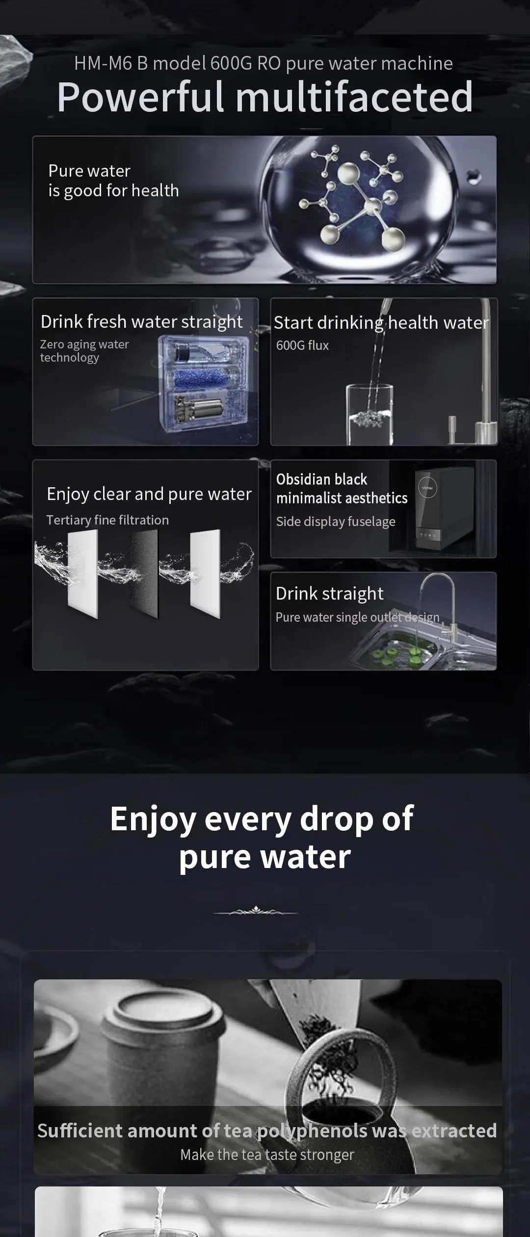 M6B model is integrated waterway design, water and electricity separation, safe and efficient water purifier. Using the United States GE diaphragm, aerospace grade RO reverse osmosis technology, water can be drunk. Advanced configuration brings better experience, original and leading technology, so that the product durability, stability is stronger, achieve lower core replacement costs. High quality activated carbon Apex linguae can enjoy the sweetness. Fresh water technology, fresh and sweet, not overnight water Effectively solve the problem of high TDS value of the first glass of water