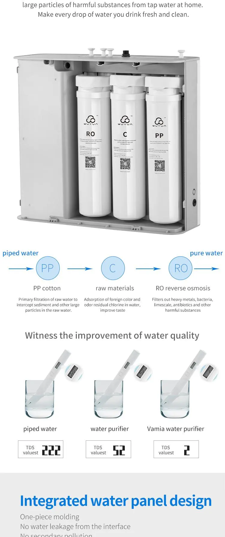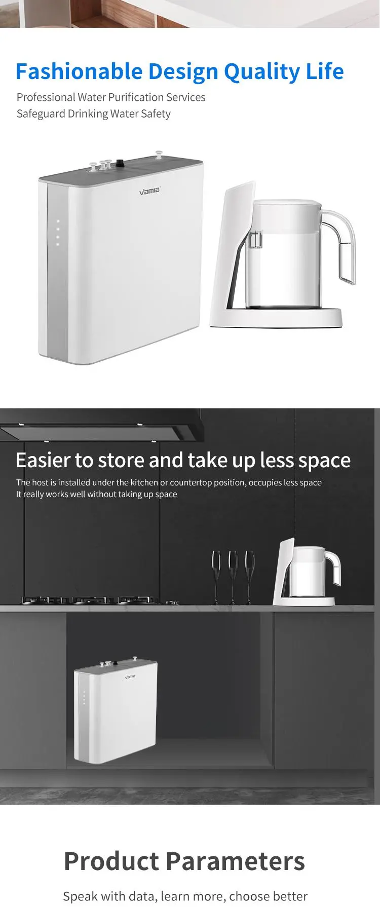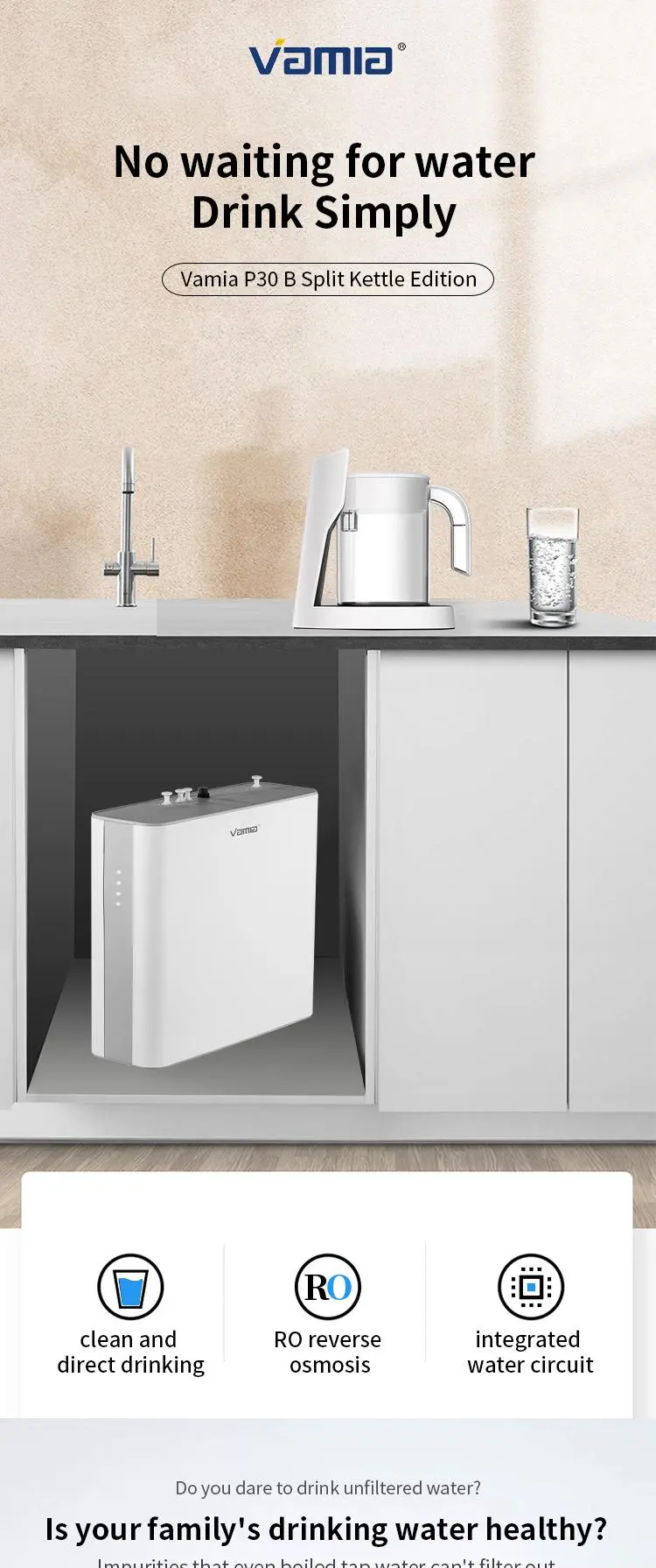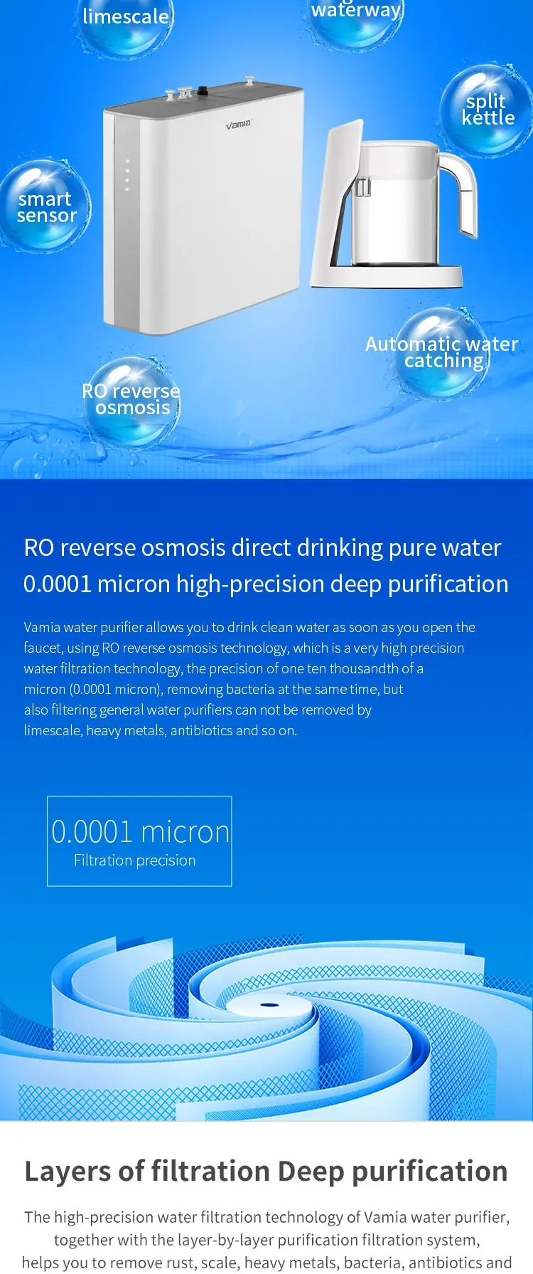 The P30B model is Vamia high-precision water filtration technology of the water purifier, combined with the layer-by-layer purification filter system, can help you remove rust, scale, heavy metals, bacteria, antibiotics and large particles of harmful substances in the tap water at home. Make every drop of water you drink fresh and clean.