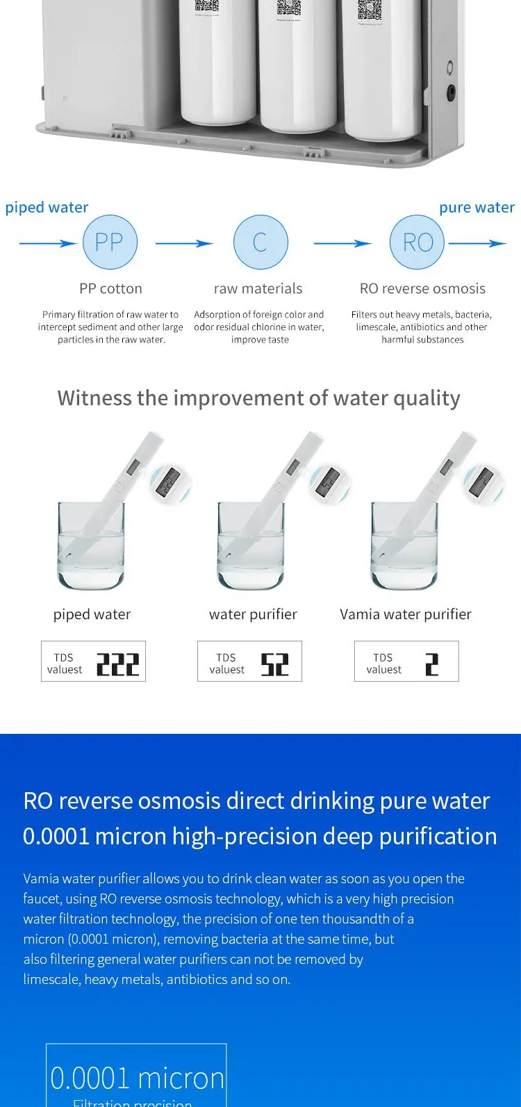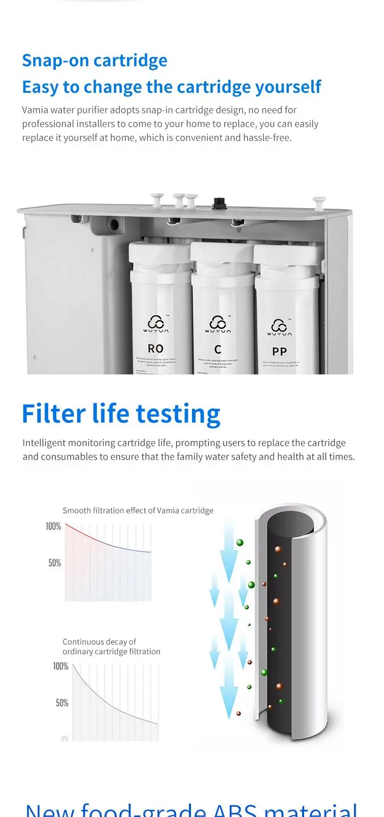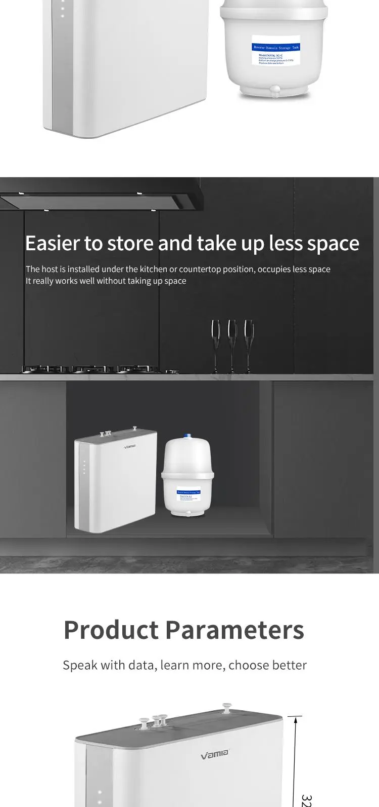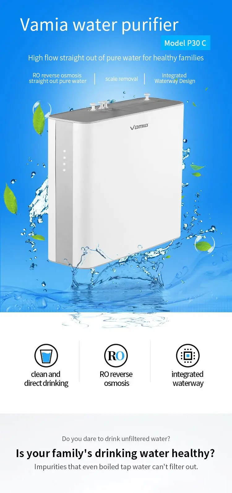 The P30C model is cto carbon filter cartridge under sink CE approval filtration system home appliances reverse osmosis water purifier. Vamia water purifier allows you to drink clean water as soon as you turn on the faucet. The RO reverse osmosis technology is a very high-precision water filtration technology with a precision of one ten thousandth of a micron (0.0001 micron). It can remove bacteria at the same time. It can also filter scale, heavy metals, antibiotics, etc. that cannot be removed by general water purifiers.