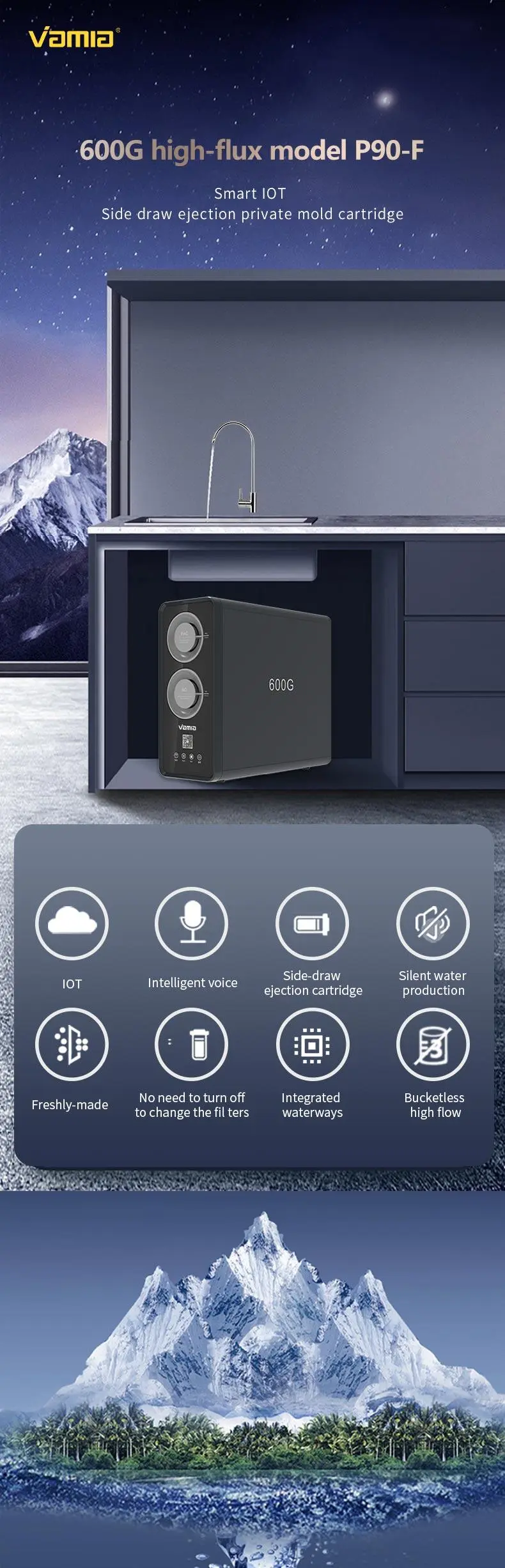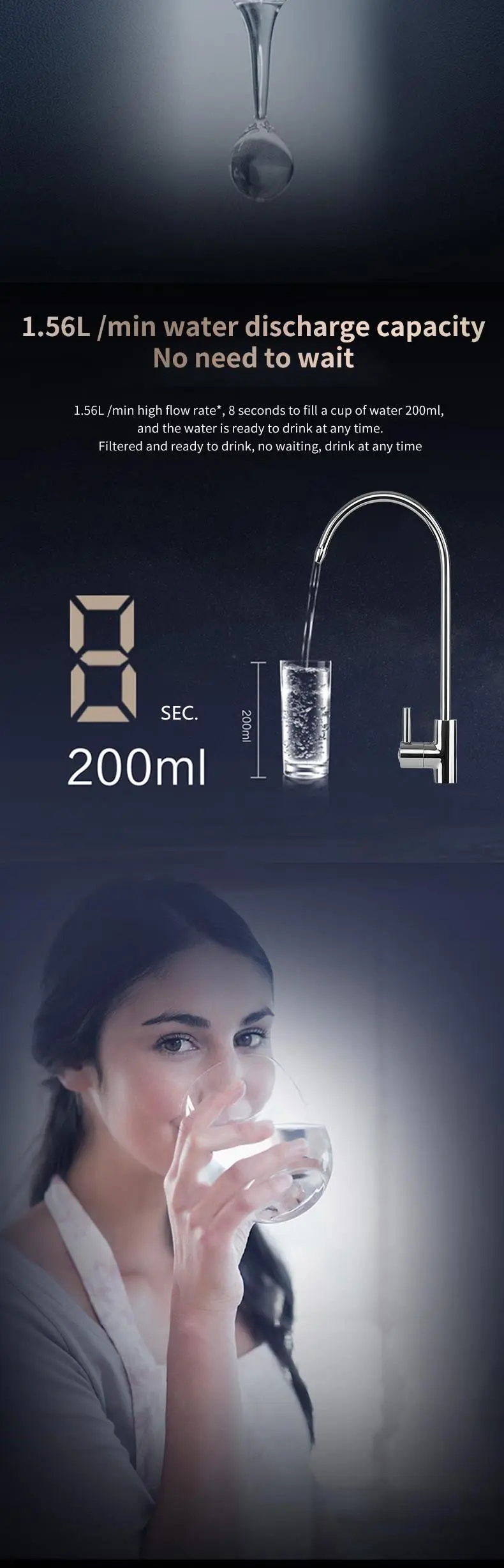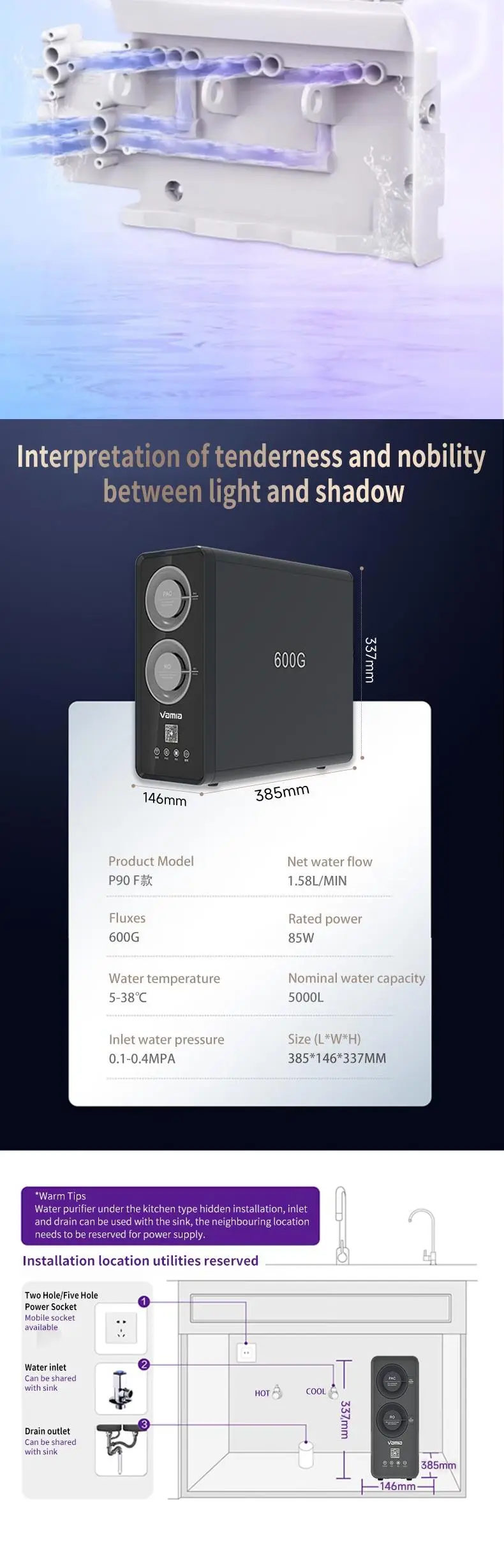 P90F model is integrated waterway design, water and electricity separation, safe and efficient water purifier. Using the United States GE diaphragm, aerospace grade RO reverse osmosis technology, water can be drunk. Advanced configuration brings better experience, original and leading technology, so that the product durability, stability is stronger, achieve lower core replacement costs. High quality activated carbon Apex linguae can enjoy the sweetness. Fresh water technology, fresh and sweet, not overnight water Effectively solve the problem of high TDS value of the first glass of water