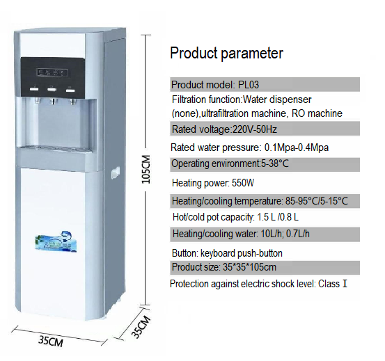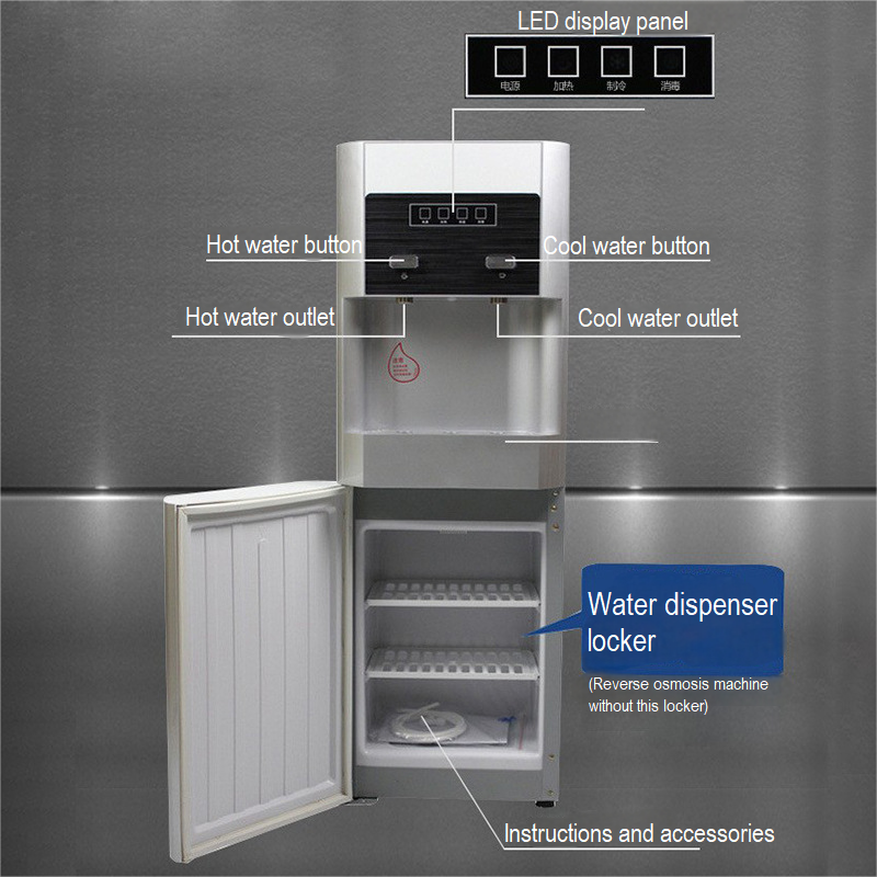 1, Korean design, positioning high-end; 2, large LED color light display, working status at a glance; 3, standard with 3 liters of hot water, to meet your hot water needs; 4, three taps respectively warm and cold three kinds of water, to meet your different drinking requirements; 5, RO direct drinking system, can use 10 inch filter barrel direct drinking system or Korean direct drinking system; 6. Built-in 3.2G plastic pressure barrel.
