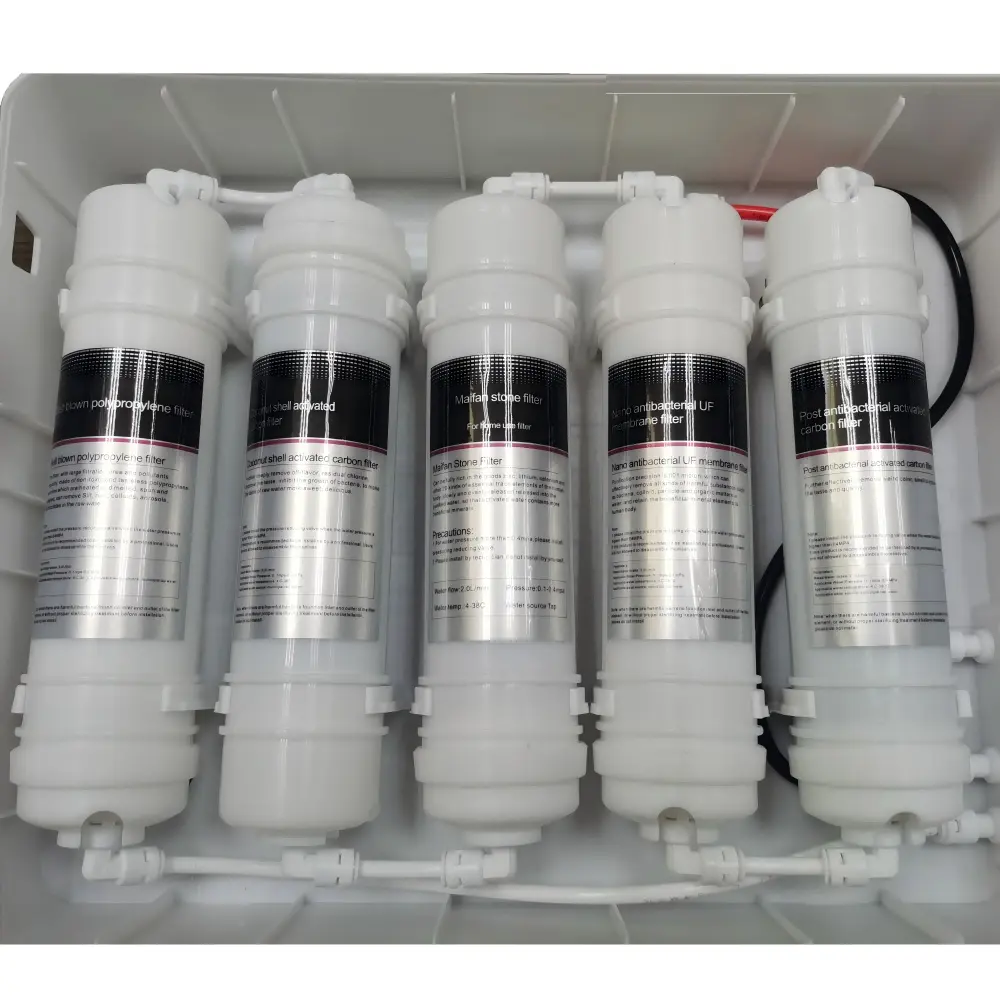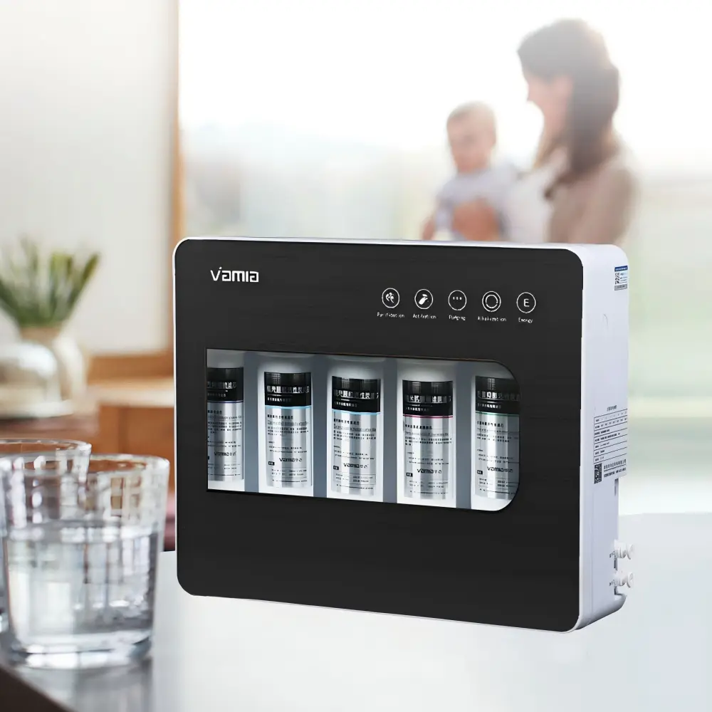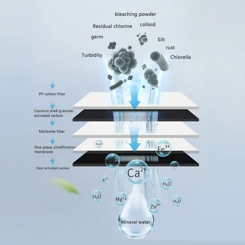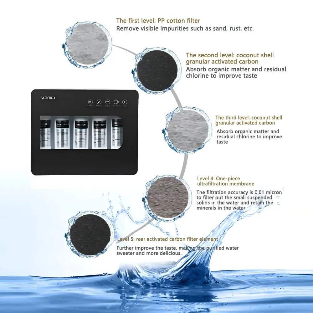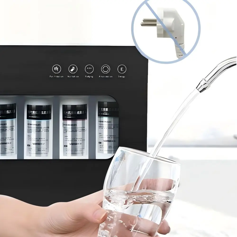 V2B is an ultrafiltration machine Hollow fibre PS ultrafiltration membrane, 0.01 um filtration accuracy. Pure physical purification, no electricity, zero waste water. Box-type water purifier, beautiful atmosphere. 5 stage filter element filter out harmful substances and retain minerals that are beneficial to the human body.