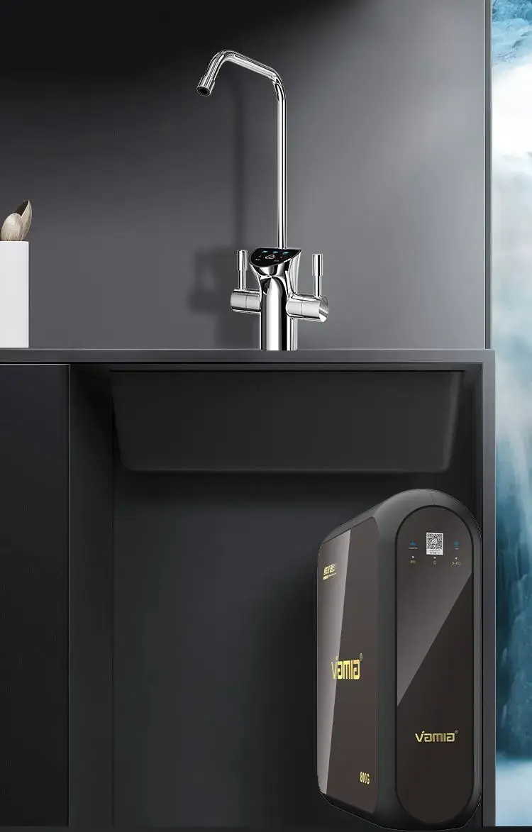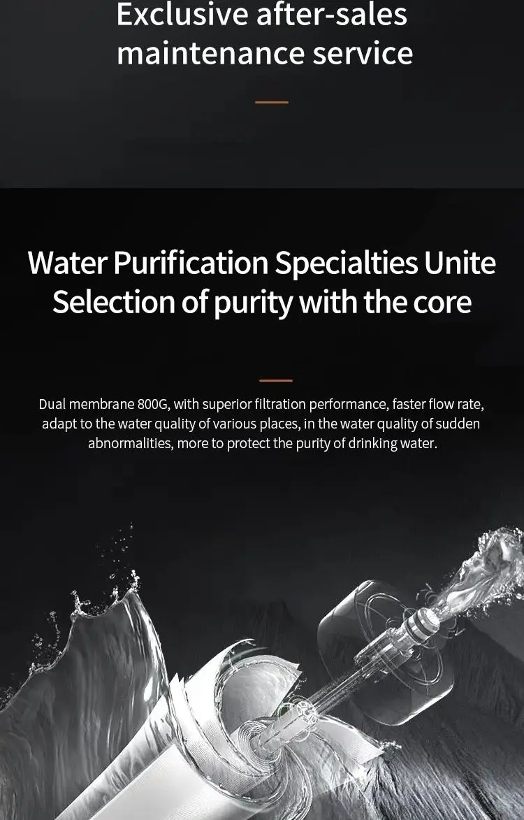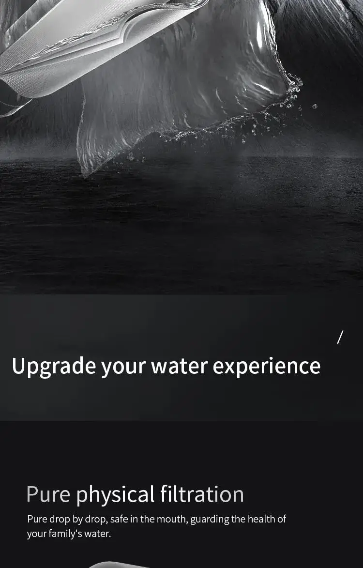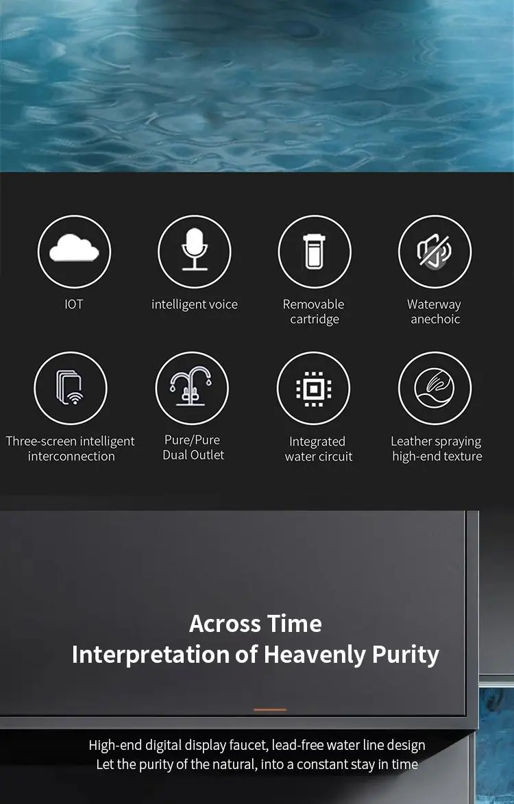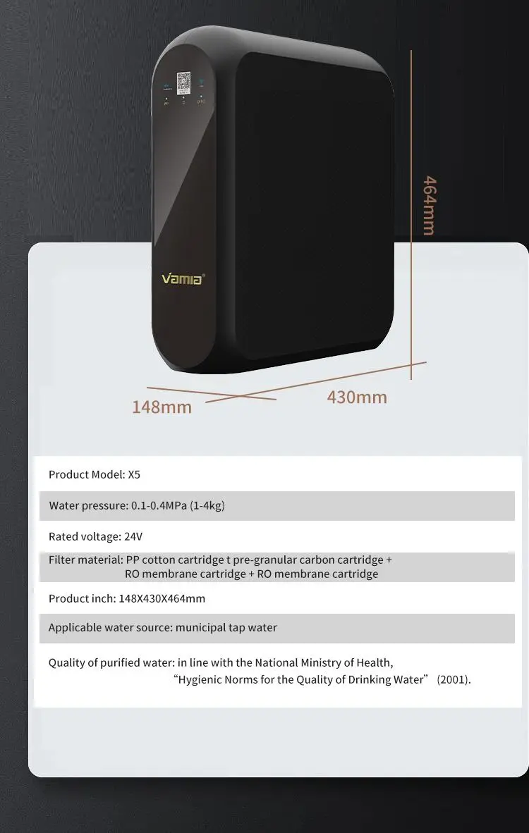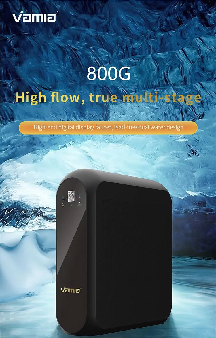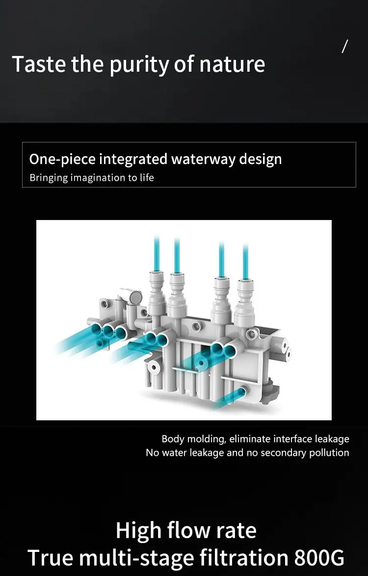 The X5 800G reverse osmosis water purifier has 4 filters, voice broadcast, filter replacement reminder. Integrated waterway design, lead-free waterway, double outlet design. Filter element is a detachable environmentally friendly rotating filter element, high-end leather spray shell, with high-end digital display faucet.